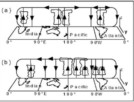 Figure 4 - Changes in the Walker Circulation during (a) La Nina and (b) El Nino periods. During La Nina, the Amazon region experiences higher-than-average precipitation. During El Nino, the main convection center shifts to the central Pacific, convection over Amazonia weakens, and the precipitation totals drop below average. From Foley 2002