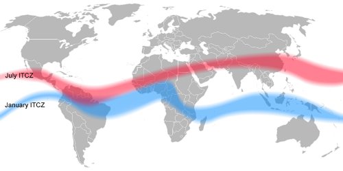 Figure 2 - relative position of the ITCZ for the northern (July) and southern (Jan) hemisphere summers. Image courtesy of Wikimedia Commons