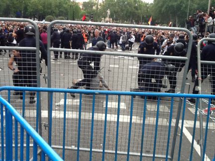 Nas imagens difundidas pela televisão espanhola, alguns dos manifestantes começaram a sentar-se no chão e a levantar as mãos em sinal de tréguas, pedindo à polícia para não avançar. Mas numa das laterais do protesto, a polícia começou a avançar, recorrendo à bastonada de forma indiscriminada. Centenas de pessoas fugiram.