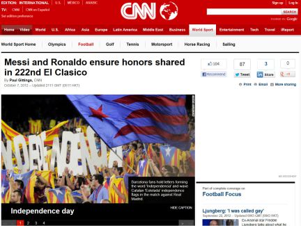 A CNN deu destaque ao jogo na sua homepage, elogiando os golos de Messi e Ronaldo, que considerou os dois melhores jogadores do Mundo: http://cort.as/2asd.