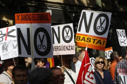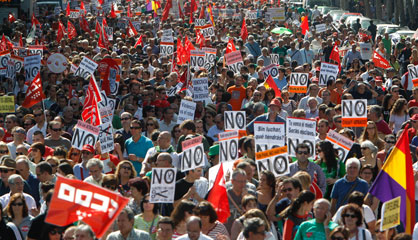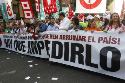 Miles de personas han salido esta mañana a las calles en 57 ciudades españolas en protesta contra los recortes y la política anticrisis del Gobierno por ser “antieconómica y antisocial”. La de hoy era la segunda gran protesta que convoca la Cumbre Social, el foro integrado por los dos grandes sindicatos, UGT y CCOO, y por unas 150 organizaciones más. La primera fue el primer paso del otoño caliente que buscan los sindicatos. La de hoy es una parada intermedia hacia una huelga general de convocatoria segura, “si el Gobierno no cambia significativamente de políticas y de actitud”, dice el el manifiesto leído al final de la marcha.